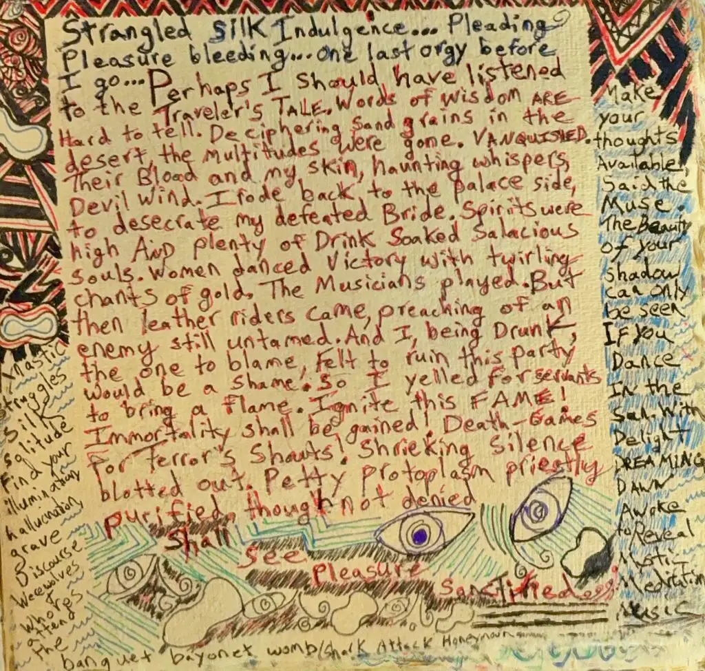 Memory flashback. New York City, Summer 2011. Spent a lot of time at Caffe Reggio in the Village, writing strange hallucinations with art thoughts. Notebook ramblings on Eugene Delacroix’s The Death of Sardanapalus. Strangled silk indulgence…pleading pleasure bleeding…one last orgy before I go…Perhaps I should have listened to the traveler’s tale. Words of wisdom are hard to tell. Deciphering sand grains in the desert, the multitudes were gone. Vanquished. Their blood and my skin, haunting whispers, devil wind. I rode back to the palace side, to desecrate my defeated bride. Spirits were high and plenty of drink-soaked salacious souls. Women danced victory with twirling chants of gold. The musicians played. But then leather riders came, preaching of an enemy still untamed. And I, being drunk, the one to blame, felt to ruin this party would be a shame. So I yelled for servants to bring a flame. Ignite this fame! Immortality shall be gained! Death-games for terror’s shouts! Shrieking silence blotted out. Petty protoplasm priestly purified, though not denied, shall see pleasure sanctified…